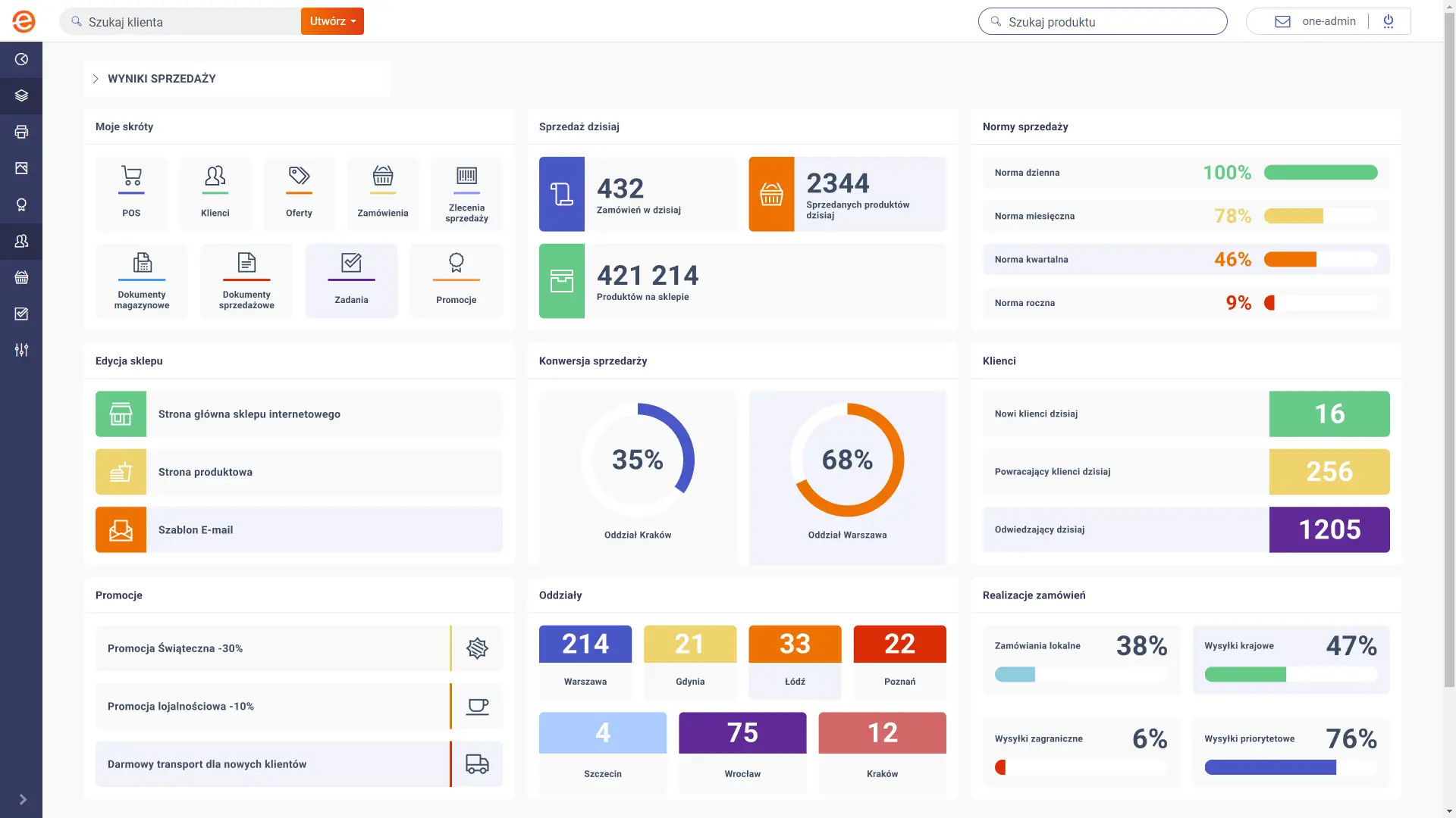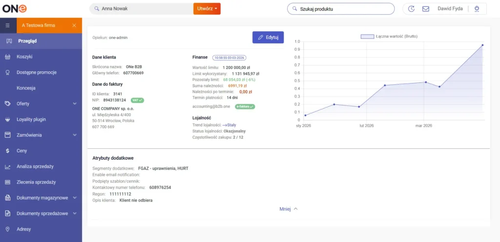 From the dashboard, the salesperson can go to customer files. The file in ONe is a classic centre of information and documents: company data, contact persons, cooperation history, sales documents, credit limit, balance, statuses, tasks and full work context. It is a strong CRM foundation that allows you to manage the customer consistently and without guesswork.