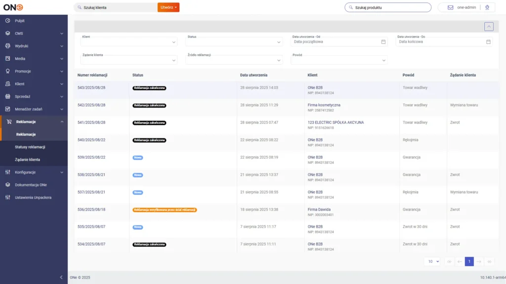 In ONe, complaints can be submitted by both customers on the B2B platform and sales representatives from the sales representative panel. The entire process is conducted in the system, with full customer and document context. Regardless of who initiates the process, whether it is the customer or the sales representative, it is transparent to everyone involved.