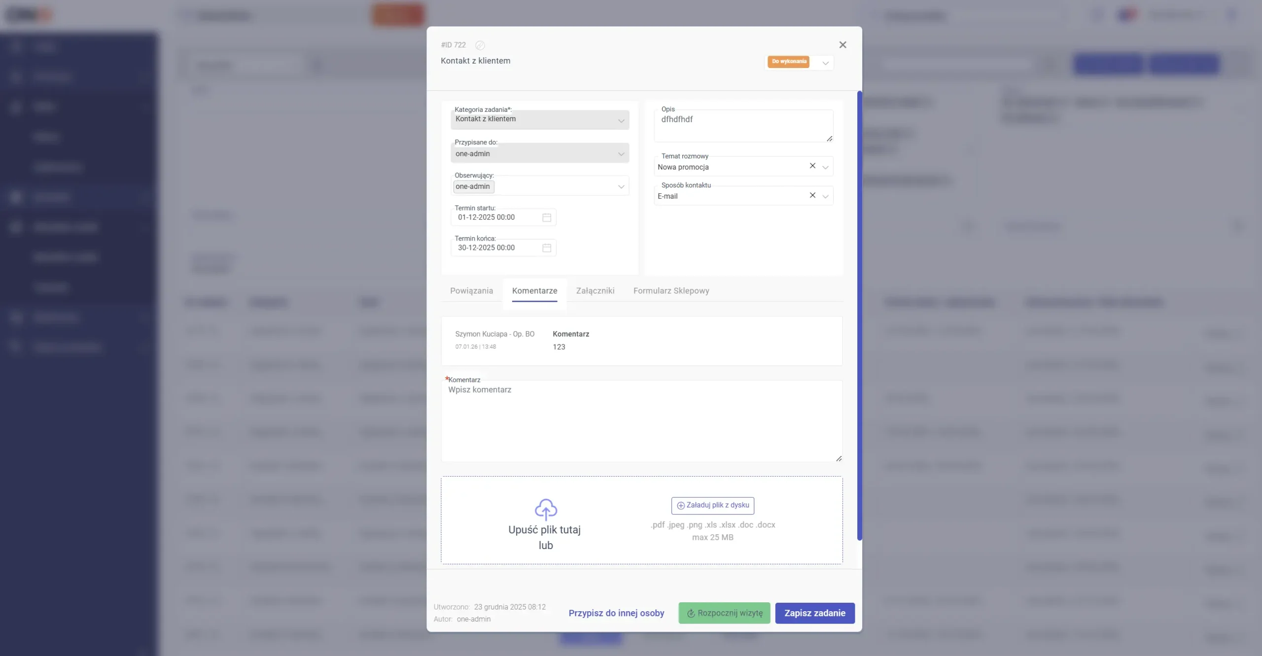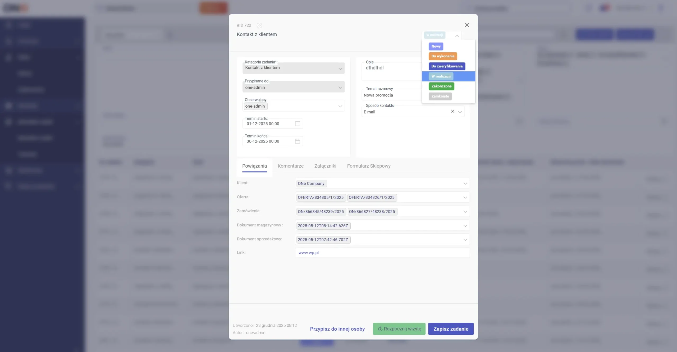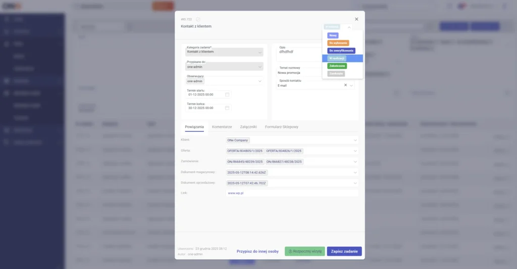 A recently introduced, innovative solution – tasks created from forms on the platform. The customer submits an enquiry at the place (on the platform) where they are shopping, and after sending, the request is automatically converted into a task for the salesperson – with assignment and deadline. Thanks to this, enquiries do not get ‘lost’, and the team handles them on an ongoing basis using the same system in which they perform all other sales tasks.