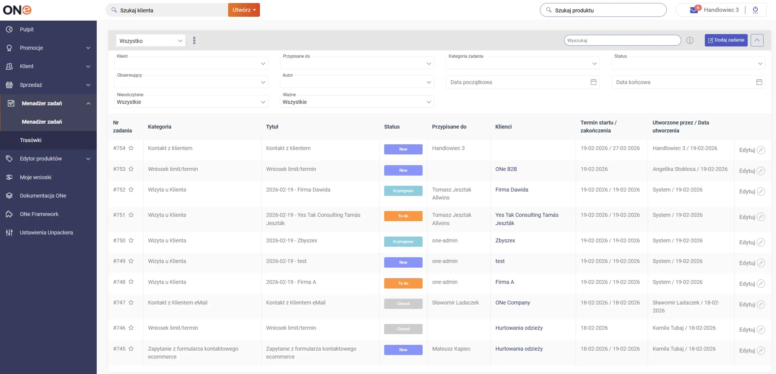 A note can be added to each task, and selected task types lead directly to action in the system. In subsequent stages of ONe’s development, tasks will also be created automatically, supported by algorithms based on customer analytics and AI.