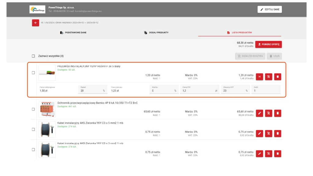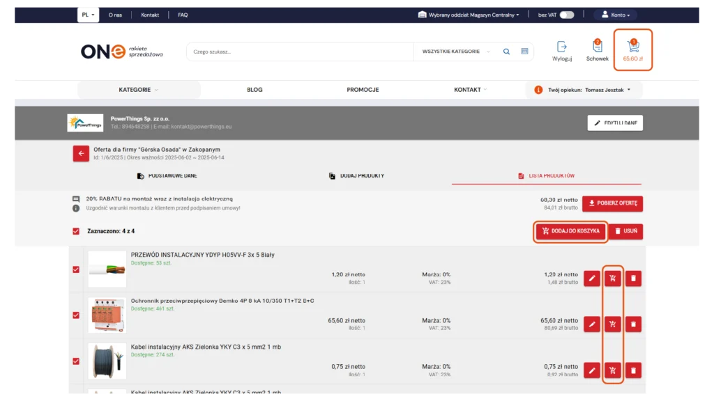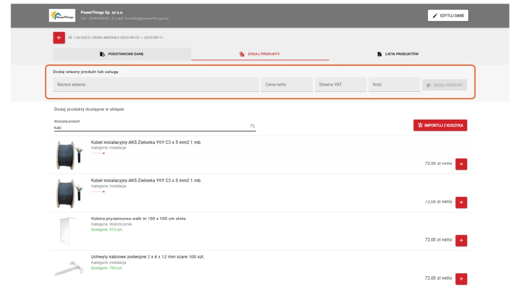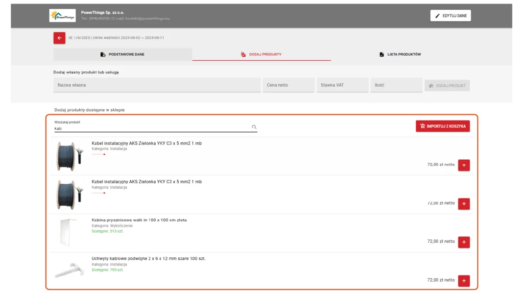 A termékek importálhatók a kosárból az ajánlatba vagy az ajánlatból közvetlenül a kosárba – mindkét irányba, teljes likviditással.