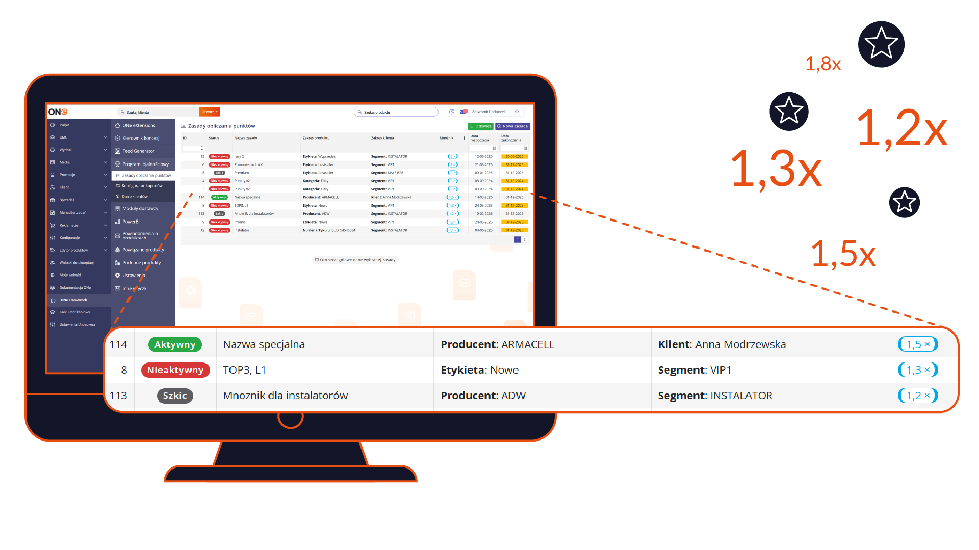 Minden termékhez pontérték rendelhető, és a végső pontszám szorzókkal növelhető. A szorzókkal kiválasztott termékeket, kategóriákat, gyártókat vagy jelöléseket (pl. címkék a PIM-ben) lehet jutalmazni – meghatározott időben és kiválasztott ügyfélcsoportok számára.